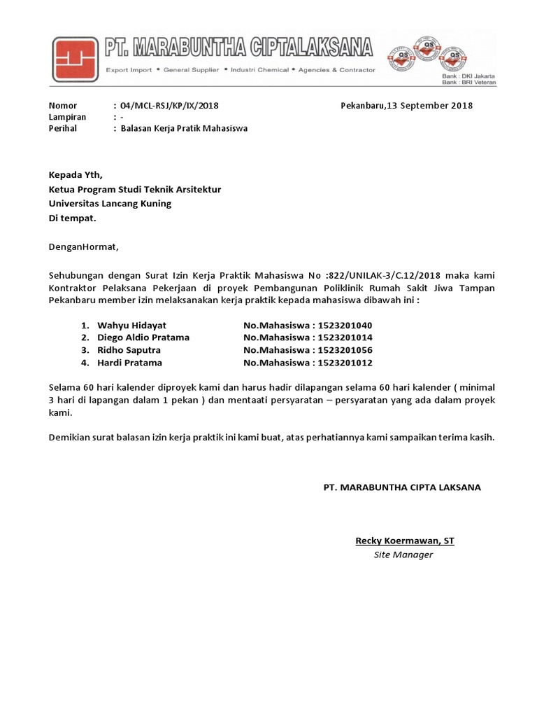 Contoh surat balasan prakerin surat balasan praktek kerja lapangan no. Walaupun surat ini sama sama dikeluarkan oleh perusahaan tapi isi dari surat keterangan magang ini berbeda dari surat pengalaman kerja. 689un 186dt2016 yang diajukan kepada kami oleh mahasiswa bapak atas nama. Contoh surat balasan penerimaan magangkerja praktik kop surat perusahaan yogyakarta 14 agustus 2012. Mencari informasi terkait contoh surat balasan kerja praktek dari perusahaan. Prosedur pelaksanaan praktek kerja.