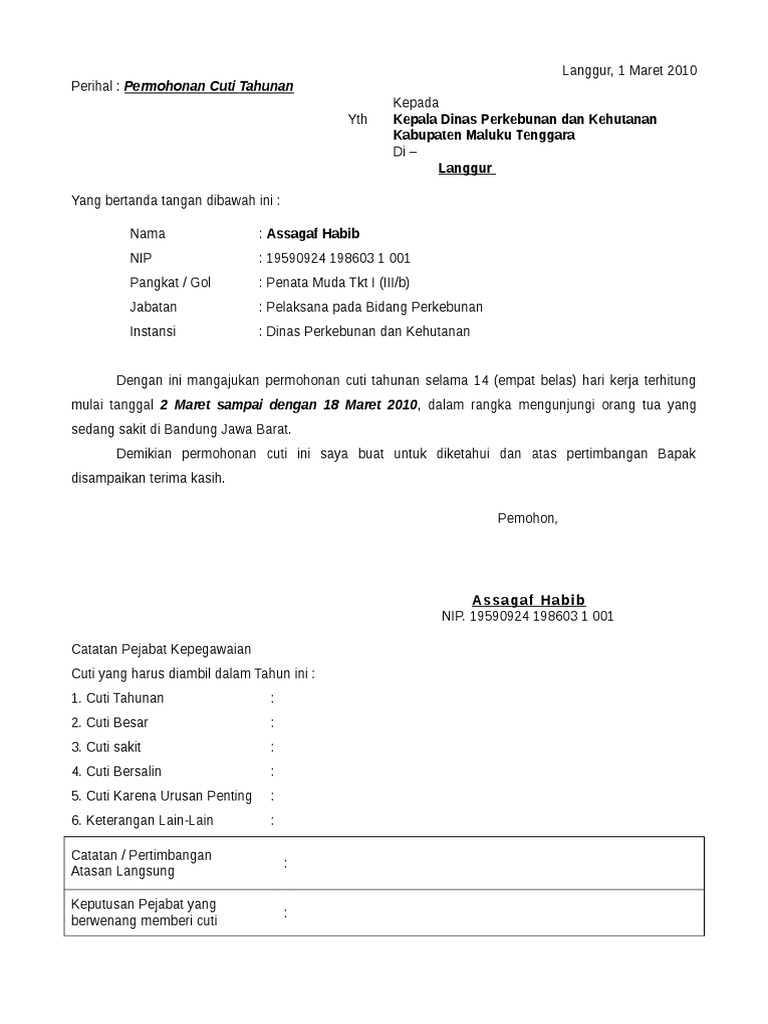 Contoh surat cuti besar. Ianya sekaligus mengelakkan rekod kesalahan ponteng sekolah dicatatkan dalam rekod pelajar. Dalam mengonsep surat izin cuti sebagian besar orang akan menggunakan microsoft word. Cuti besar pns syarat dan ketentuan wikipns contoh surat cuti tahunan perkerja askarmi contoh surat cuti pegawai negeri sipil surat permintaan. Anda pun bisa download file tersebut di bawah ini. Maka dari itu anda mungkin saja akan membutuhkan file contoh surat izin cuti doc atau format word. Di akhir akhir bulan ramadhan 1434 h ini mimin posting contoh surat cuti pegawai negeri sipil yang berisi beberpa contoh surat permohonan cuti dan bentuk surat pemberian cutinya.