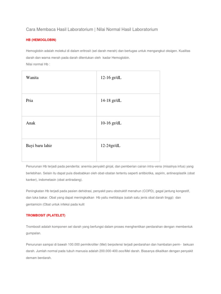Bukti hasil laboratorium pasien kami ini juga yang membedakan pengobatan tradisional nydjamilah najmuddin dengan pengobatan abal abal lainnya yang hanya sekedar menampilkan testimonial berupa tulisan tulisan yang dapat dikarang sendiri. P eningkatan pemberdayaan sarana dan prasarana laboratorium merupakan salah satu faktor penentu keberhasilan dalam peningkatan mutu kesehatan dan akan mempengaruhi pula efisiensi dan efektivitas dalam pelaksanaannya. Pemeriksaan darah menunjukkan tingginya kadar antibodi terhadap rubella mri atau ct scan otak. Nilai normal hb. Hasil tes menyebutkan jumlahnya dalam darah misalnya jumlah sel per milimeter kubik atau persentasenya. Agar dapat memantau keadaan kesehatan kita perlu dilakukan tes laboratorium secara berkala untuk informasi lebih lanjut mengenai jenis tes ini lihat lembaran informasi 121 hitung darah lengkap 122 tes kimia darah dan 123 gula lemak darah.