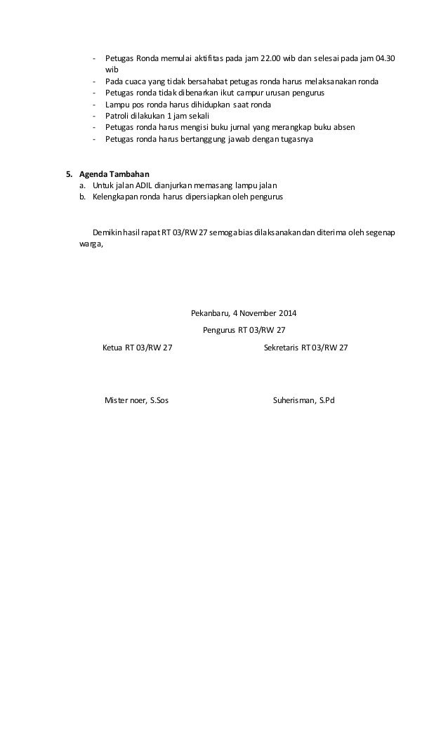 Contoh surat diatas bisa anda gunakan sebagai bahan perbandingan untuk menyampaikan hasil keputusan rapat di tingkat rt. Pada notulen rapat memiliki bentuk padat singkat ringkas dan sistematis agar ketika acara sudah selesai seseorang dapat mengetahui hasil rapat sebagai bahan dokumentasi.