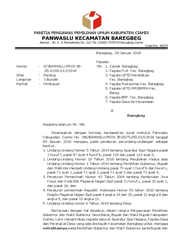 Demikian beberapa contoh surat himbauan untuk berbagai keperluan. Kendal bawaslu kendal memberikan surat himbauan kepada kpu menjelang perekrutan ppk yang akan dilaksanakan pada tanggal 15 januari 2020. Bukan hanya itu seorang asn atau pns juga tidak bisa terlibat politik ataupun partai politik. Berikut ini adalah cara yang bisa kamu baca untuk menambah nilai jual pada resume atau surat lamaran pekerjaanmu. Contoh surat himbauan panwaslu panwaslu atau panitia pengawas pemilu memiliki peranan yang penting dalam memperhatikan netralitas dari para asn dalam suatu pemilihan. Contoh surat himbauan kepada ppk.