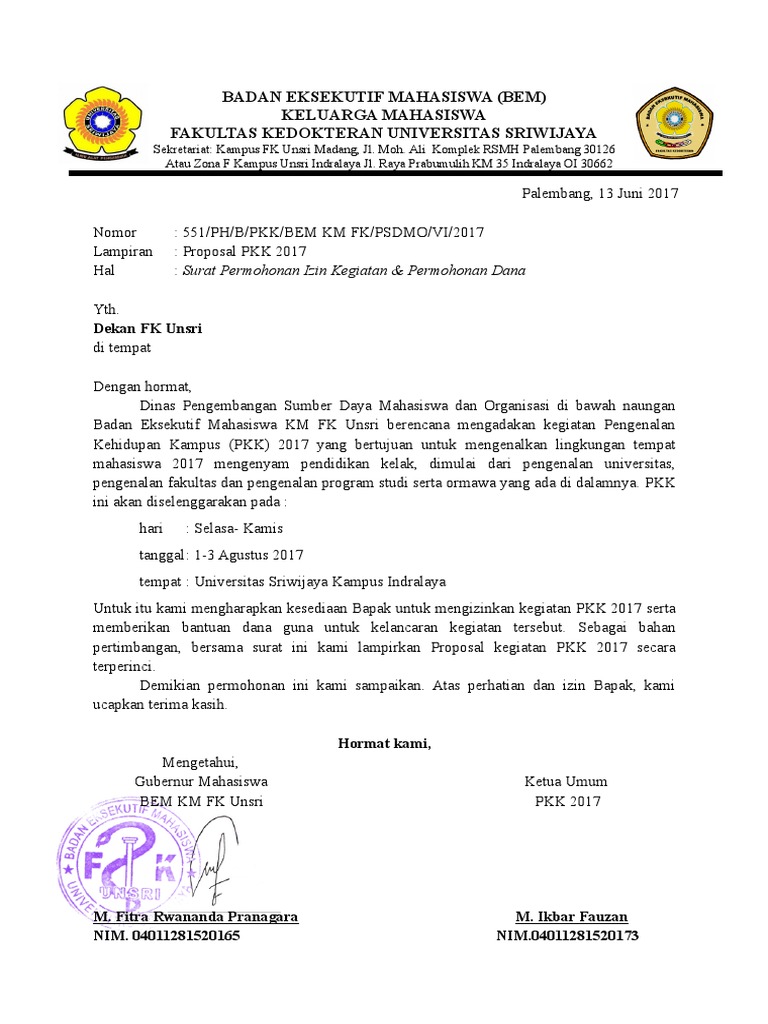 Contoh surat izin kegiatan kampus. Biasanya kampus juga menyediakan format surat izin kuliah untuk mahasiswanya. Asal tak bolos atau tidak masuk lebih dari empat kali di tiap mata kuliah maka mereka merasa aman. 00 1 pan odm bem dccmenpolx i 201 4. Contoh surat permohonan izin seperti surat surat lainnya yang memiliki beragam jenis di sebabkan oleh tujuan pembuatan dan fungsi surat yang berbeda yang sebelumnya sudah di bahas di blog ini seperti surat permohonan bantuanpada kesempatan kali ini kami akan mencoba menulis surat permohonan izin yang pada intinya tujuan yang di miliki adalah sama yaitu isinya tentang pengajuan permohonan. 15 contoh surat pemberitahuan kegiatan resmi yang baik seiring dengan kemajuan zaman dan perkembangan teknologi yang semakin canggih media komunikasi yang tersedia sekarang ini juga sudah semakin canggih. Kampus parang tambung jl.