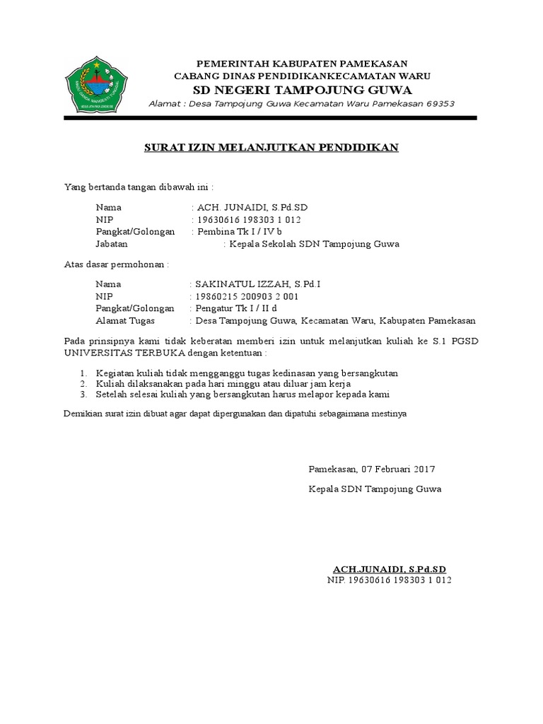 Rincian tugas guru kelas ada 15 macam rincian kegiatan guru kelas yang mendapatkan angka kredit untuk kenaikan pangkat. 4212 iisd2009 yang bertandatangan dibawah ini. Surat izin belajar mengikuti perkulihan dari kepala sekolah by ruslan 28 nov 2017 post a comment permendikbud ri nomor 46 tahun 2016 mengharuskan tentang penataan lnearitas guru bersertifikat pendidik atau biasa dikenal dengan guru bersertifikasiperaturan ini mulai berlaku tanggal 4 januari 2016. Di saat sekolah mendapatkan undangan untuk mengikuti lomba olimpiade atau turnamen lainnya. Sayangnya mahasiswa jaman sekarang kadang menggap enteng. Contoh surat izin kuliah pemerintah kabupaten tasikmalaya dinas pendidikan uptd pengelola tk sd dan slb kec.