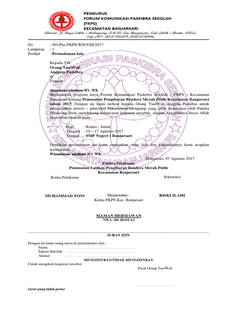 Contoh surat izin orang tua untuk mengikuti kegiatan paskibra. Kegiatan sekolah seperti rekreasi atau perpisahan kelas sudah menjadi hal yang trend bagi siswa. Related posts to contoh surat izin orang tua untuk mengikuti kegiatan paskibra contoh surat izin orang tua untuk mengikuti kegiatan paskibra 2018 01 31t121900 0800 rating. Inilah pembahasan selengkapnya mengenai contoh surat izin orang tua untuk mengikuti kegiatan paskibra. Admin blog dapatkan contoh 2019 juga mengumpulkan gambar gambar lainnya terkait contoh surat izin orang tua untuk mengikuti kegiatan paskibra dibawah ini. Misalnya kegiatan outbound kemah pendakian gunung dan lain lain. Orang tua wali siswa anggota paskibra muda di tempat.