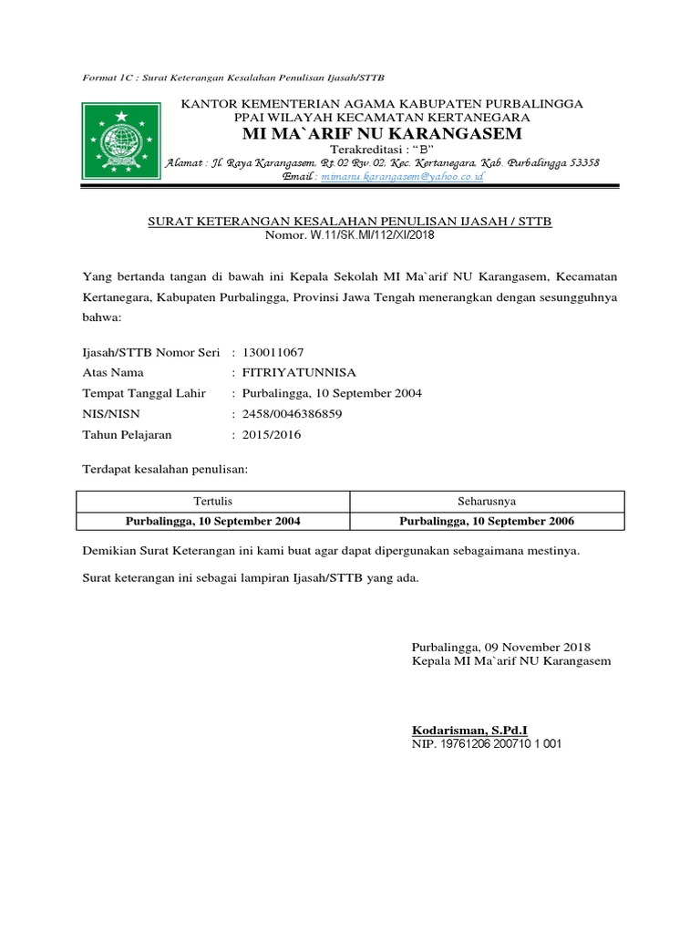 Contoh surat keterangan kesalahan penulisan ijazah. Berikut ini kutipan teks sebagai gambaran dari isi berkas contoh surat keterangan kesalahan penulisan ijazah. Surat keterangan kesalahan penulisan ijazah terbaru dalam penulisan ijazah seringkali terdapat kekeliruan dalam penulisannya baik dari segi nama siswa tanggal lahir siswa nama orang tua siswa atau nomor induk siswa nasional nisn ataupun hal yang berkaitan dengan data siswa lainnya. Kesalahan penulisan nama pada ijazah atau pun kesalahan penulisan nama orang tua kesalahan penulisan tempat dan tanggal lahir dan hal hal lainnya sering terjadi. Dan semoga kita lebih berhati hati supaya tidak terjadi kesalahan saat penulisan blanko ijazah. Surat keterangan kesalahan penulisan ijazahsttb sekolah masih operasional. Format surat keterangan kesalahan penulisan ijazah ini bisa kita gunakan baik di sd smp smk atau sederajat.