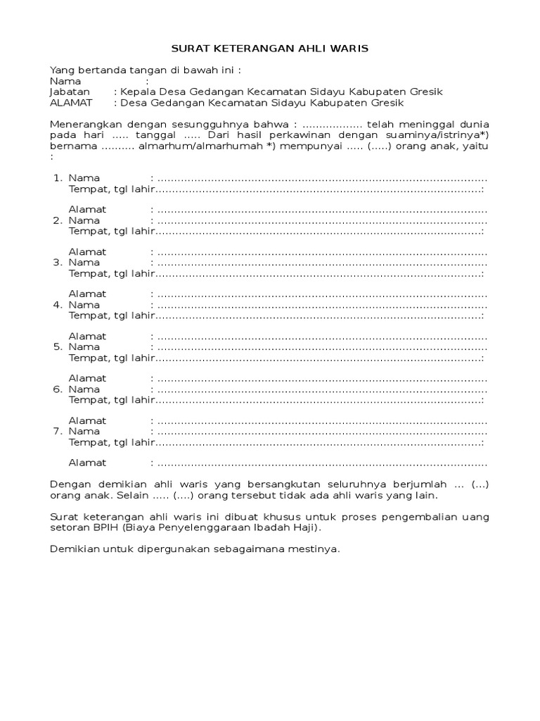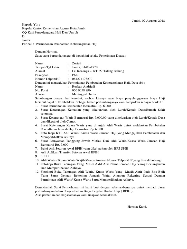 Surat pendaftaran pergi haji spph asli surat permohonan batal asli surat pernyataan asli bermaterai 6000 surat kuasa asli bermaterai 6000 surat keterangan waris dari kelurahan mengetahui kecamatan copy surat kematian dari kelurahan copy kartu tanda penduduk ktp calon haji dan semua ahli waris serta kuasanya copy. Diantaranya untuk mengurus taspen pembatalan haji dan pengambilan tabungan. Surat keterangan ahli waris sering diminta saat mengurus keuangan keluarga yang meninggal. 10 kelurahan asam manis kecamatan melodi indah kota bandung. Contoh surat contoh surat lamaran yang baik 2016.
