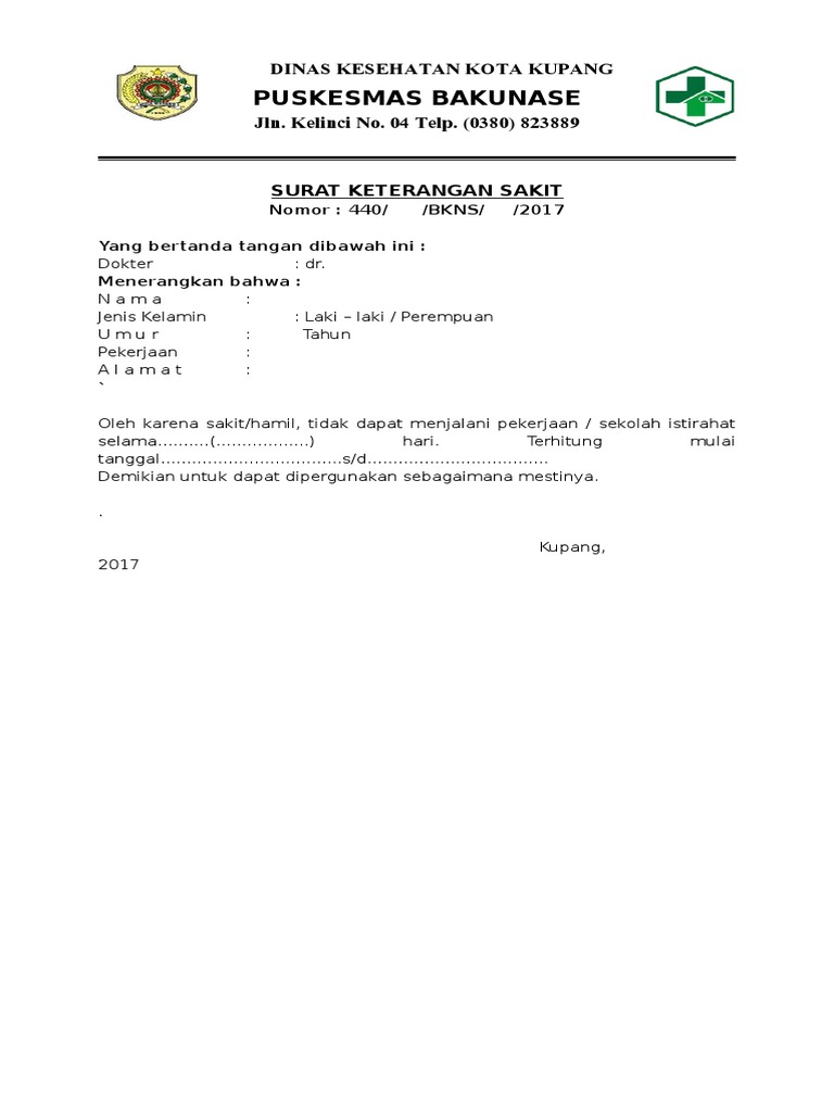 Contoh surat keterangan sakit dari puskesmas. Surat keterangan sakit ini bisa anda jadikan sebagai lampiran dalam surat izin yang anda kirimkan kepada guru sekolah dosen kampus maupun atasan di tempat kerja.