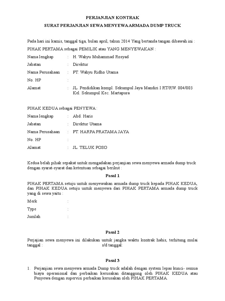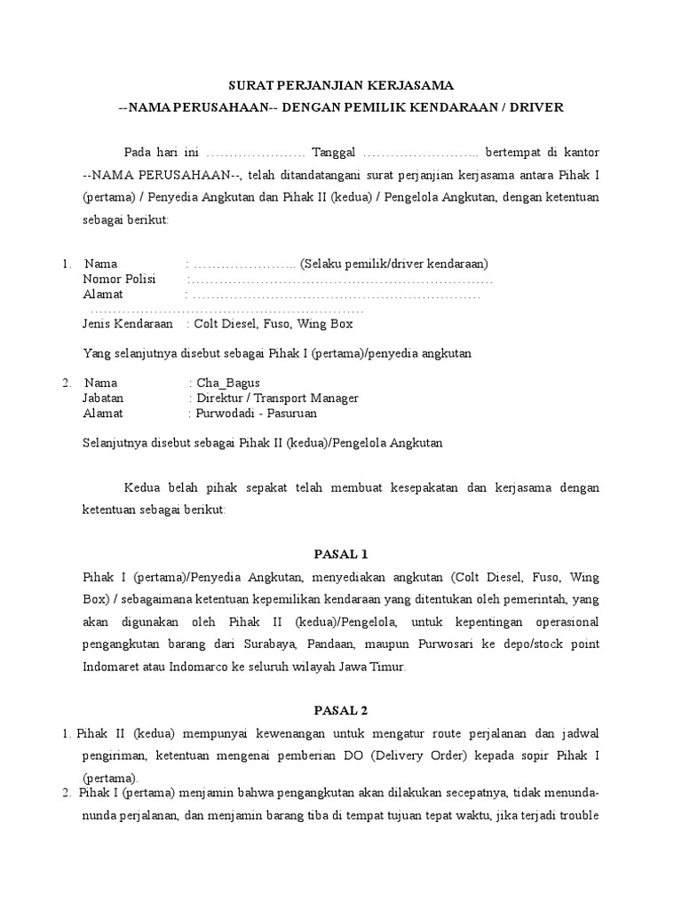 Contoh surat kontrak sopir. Semoga bermanfaat untuk anda yang sedang menulis format surat keterangan kerja. Halo rekan dunia hukum surat perjanjian melalui blog ini akan dibagikan contoh surat perjanjian kemitraan antara supir dengan perusahaan jasa pengangkutan yang dibuat dengan bahasa yang sangat sederhana untuk memudahkan memahami maksud dan tujuannya. Surat perjanjian kerja karyawan ini bisa dimodifikasi sesuai situasi kondisi dan kesepakatan. Ada banyak lowongan pekerjaan yang disediakan oleh berbagai macam instansi ataupun perusahaan baik negeri atau swasta. Cuti diberikan dengan surat keputusan dari pejabat yang berwenang memberikan cuti setelah mendapat izin dari kepala bakn. 15 contoh surat perjanjian sewa mobil paling lengkap pada dasarnya sewa menyewa mobil bisa dilakukan secara pribadi atau melalui jasa atau usaha rental mobil.