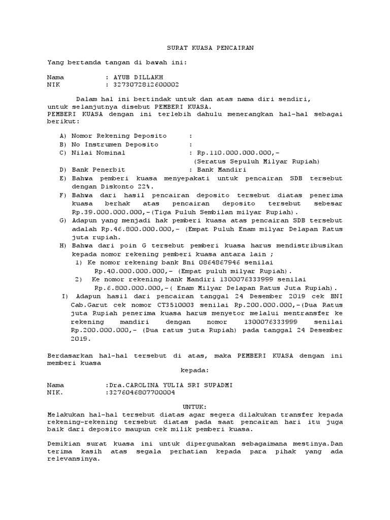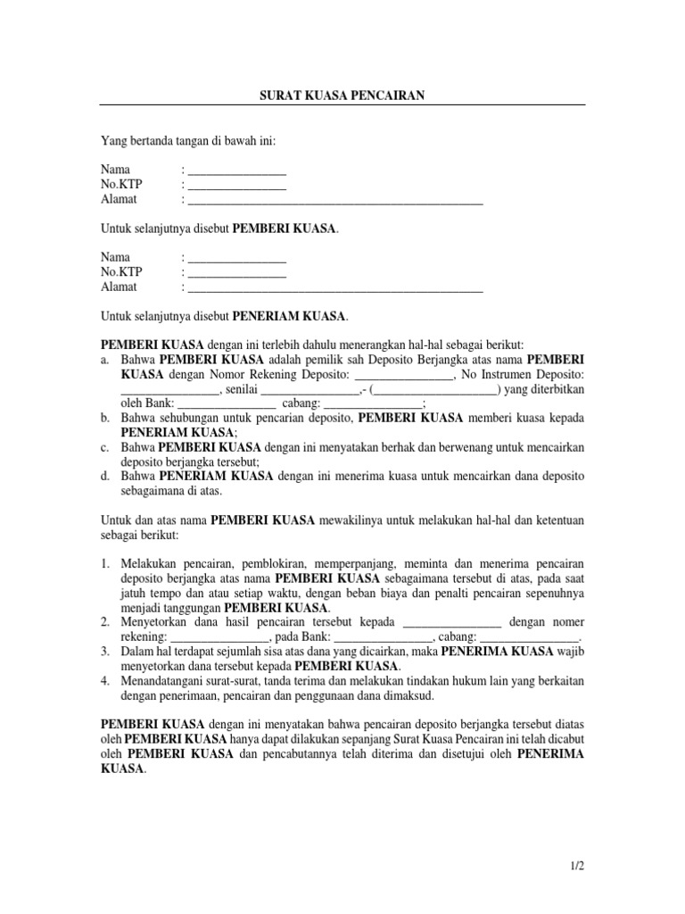 Berikut ini adalah contoh surat kuasa pencairan deposito download. Kuasa untuk pencairan deposito. Kuasa untuk mengurus pajak. Contoh surat kuasa pengurusan dan pengambilan register akuntan. More about contoh surat kuasa pencairan deposito. Itulah 7 contoh surat kuasa pencairan deposito bank kami berharap contoh surat yang kami sampaikan dapat membawa manfaat untuk anda dan bila dirasa anda masih kurang puas dengan contoh surat dari kami maka kami memohon maaf sebesar besarnya karena kami menyadari bahwa blog ini masih jauh dari kata sempurna untuk itu kami mohon masukan dan saran dari anda demi kemajuan blog ini.