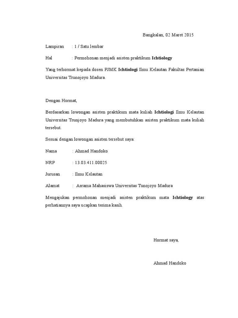 Berikut ini merupakan contoh surat lamaran untuk menjadi asisten laboratorium komputer. Ketua laboratorium terpadu teknik informatika di universitas muhammadiyah jember dengan hormat. Semoga bisa membantu sobat dalam membuat surat lamaran asisten praktikum. Bermaksud untuk mengajukan lamaran pekerjaan sebagai asisten laboratorium komputer dasar teknik informatika stt pln jakarta. Bagi kamu yang ingin melamar sebagai asisten lab pada perusahaan dengan menggunakan surat lamaran berbahasa inggris contoh berikut ini bisa kamu gunakan meskipun tentunya harus kamu modifikasi sesuai kebutuhanmu. Contoh surat lamaran asisten praktikum dan curriculum vitae 20142 jember 17 februari 2015.