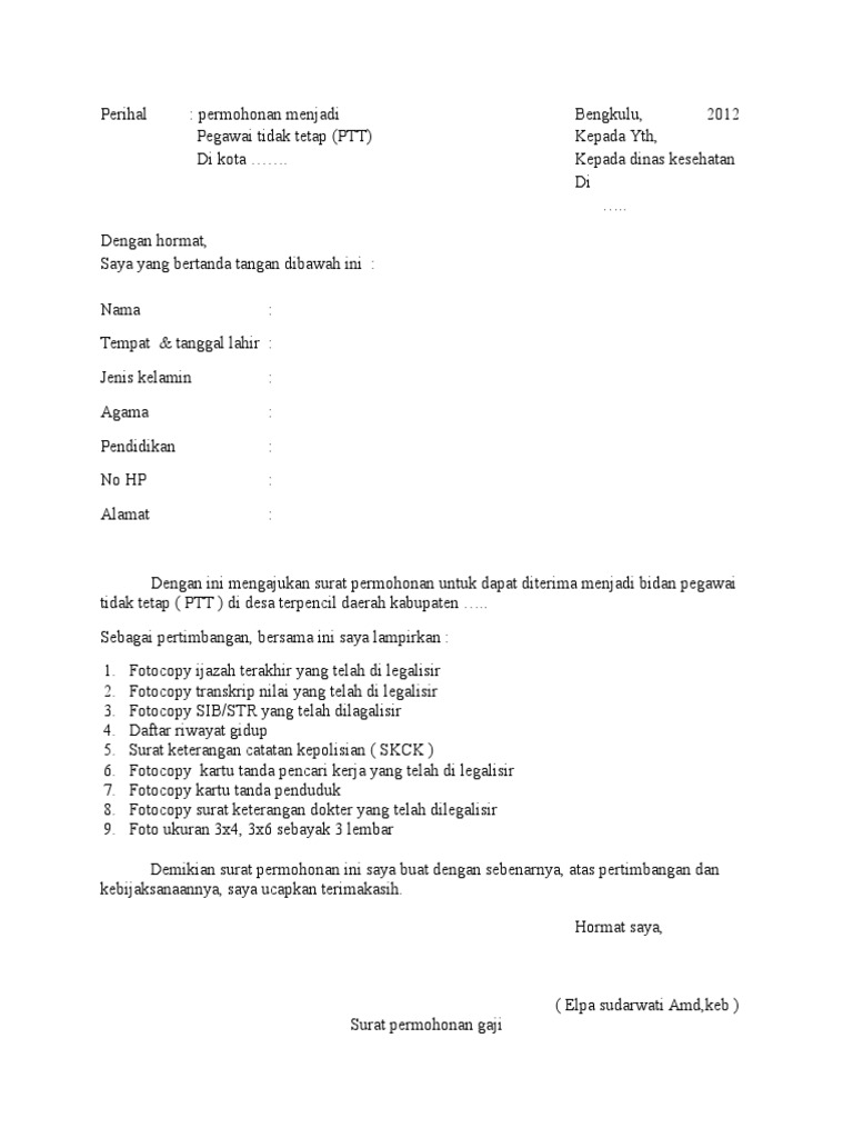 Admin blog kumpulan surat penting 2019 juga mengumpulkan gambar gambar lainnya terkait contoh surat lamaran kerja bidan ptt dibawah ini. Sama dengan surat lamaran kerja pada umumnya surat lamaran kerja bidan ditulis atau dibuat untuk memenuhi persyaratan kerja sebagai seorang bidan di lembaga kesehatan yang sedang membuka lowongan kerja untuk bidan. Contoh surat lamaran guru ptt tentu surat lamaran kerja guru langsung tertuju pada posisi pengajar guru. Contoh surat lamaran kerja bidan yang ke lima adalah surat lamaran kerja dalam bahasa inggris walaupun kita nanti akan bekerja sebagai perawat di rumah sakit di indonesia tetapi kadang rumah sakit itu membuka lowongan pekerjaanya menggunakan bahasa inggris. Buat temen temen fresh graduation seperti saya semoga aja bermanfaat ya jng lupa perhatikan kerapihan tulisanyg di bawah ini masih perlu perbaikanhehe. Contoh surat lamaran kerja bidan tahukah anda bahwa pekerjaan menjadi seorang bidan kian dibutuhkan beberapa tahun terakhir ini hal ini dibuktikan dengan semakin banyaknya pembangunan puskesmas dan rumah sakit maupun klinik di indonesia memang jika ditilik secara mendalam pekerjaan bidan memang penting sebab bidan berguna dalam melakukan bimbingan dan penyuluhan kepada individu keluarga.