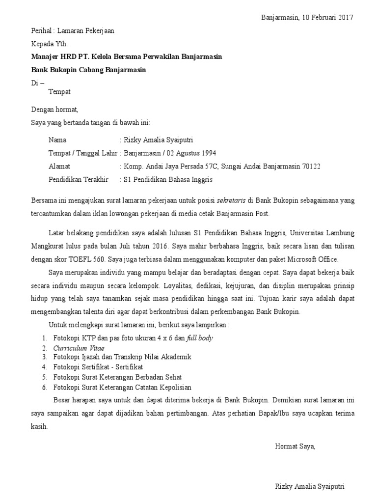Contoh surat lamaran kerja bank bukopin. Inilah pembahasan selengkapnya mengenai contoh surat lamaran kerja di bank bukopin. Seperti lamaran kerja pada umumnya terdapat beberapa hal yang harus diperhatikan ketika menyusun surat lamaran kerja antara lain. Bagi temen temen yang saat ini sedang mencari referensi tentang bagaimana menyusun sebuah surat lamaran kerja di bank bri yang baik dan benar temen temen bisa melihat contoh seperti di bawah ini. Balikpapan 23 mei 2017. Contoh surat lamaran kerja di bank sebenarnya tidak jauh berbeda dengan surat lamaran kerja pada umumnya. Nah bagi anda yang sekarang sedang mencari pekerjaan untuk bulan januari februari maret april mei juni juli agustus september oktober november dan desember disini adalah tempat yang tepat untuk mengetahui.