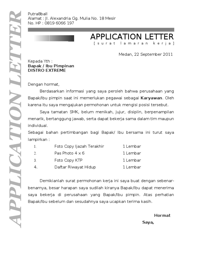 Contoh surat lamaran kerja di distro. Apalagi jika mendapatkan pekerjaan di perusahaan bergensi dengan skala nasional atau international. Karena setiap orang pada akhirnya memang akan membutuhkan sebuah pekerjaan untuk memperoleh penghasilan guna mencukupi kebutuhan sehari harinya. Format penulisan tersusun rapi dengan bahasa yang tidak bertele tele. 25 juni 2015 0241 2585 1 1 mohon tunggu. Lamaran pekerjaan yogyakarta 2 agustus 2012. Pada perjumpaan kali ini kembali akan quippercoid sampaikan pembahasan materi makalah lamaran kerja via email.
