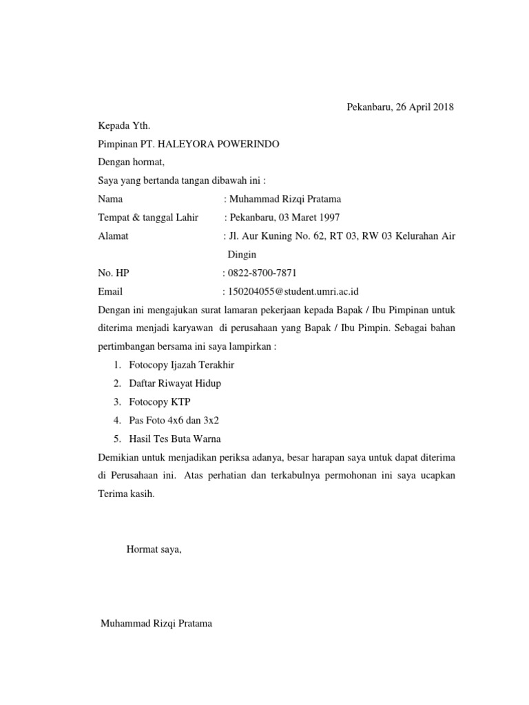 Nah jika anda juga berencana melamar pekerjaan di perusahaan maka contoh surat lamaran kerja di persuahaan yang akan saya bagikan di bawah ini patut anda simak. Contoh surat lamaran kerja membuat surat lamaran kerja tidak boleh asal dalam membuatnya membutuhkan acuan sebagai referensi contoh surat lamaran kerja ini adalah salah satu bahan yang bisa dijadikan acuan dalam membuat surat lamaran pekerjaan. Surat keterangan sehat dan tidak buta warna. Nah sebelum teman teman melakukan pendaftaran tentunya teman teman harus memenuhi syarat dan tertarik untuk bekerja di pt haleyora powerindo serta menyiapkan berkas lamaran kerja yang di susun secara rapi baik soft copy maupun hard copy. Contoh surat lamaran kerja melamar sebuah pekerjaan merupakan suatu hal yang umum terjadi pada kehidupan kita sehari hari. Informasi yang saat ini sedang anda cari yaitu contoh surat lamaran tni addibawah ini telah kami sajikan artikel yang berkaitan dengan contoh surat lamaran tni ad lulusan smk sma d1 d2 d3 s1 s2 dari berbagai jurusan lowongan kerja cpns dan bumn sebagai salah satu referensi lowonagn kerja yang mungkin anda cari.