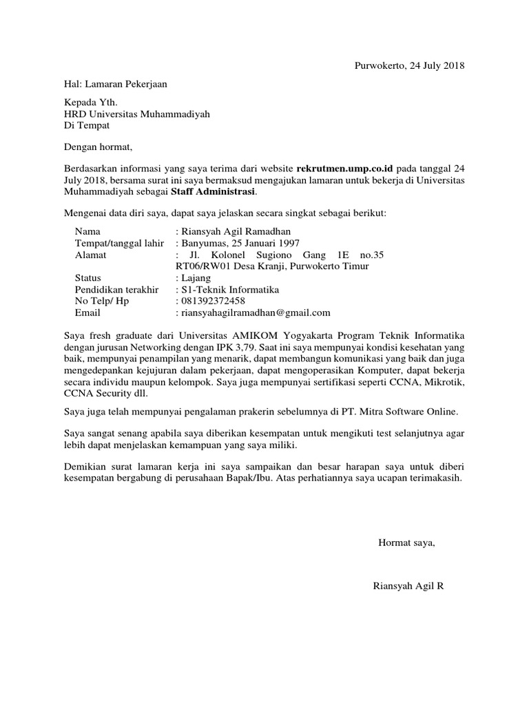 Karena utamanya apakah anda layak diterima atau tidak bekerja di sebuah perusahaan bergantung pada resume atau surat lamaran kerja yang anda kirim semakin lengkap maka semakin baik. Terutama bagi para fresh graduate yang baru saja lulus kuliah. Sebelum lanjut ke contoh surat lamaran kerja ada baiknya anda membaca kriteria dan tips untuk membuat surat lamaran kerja yang baik dan benar. Contoh surat lamaran kerja administrasi secara umum pekerjaan administrasi merupakan salah satu pekerjaan yang membutuhkan tingkat kesabaran yang tinggi dan juga mampu berkomunikasi dengan baik kepada orang lain baik itu staf perusahaan atau tamu perusahaan nah atas dasar inilah maka wajar adanya jika pekerjaan seorang administrasi umumnya didominasi oleh para wanita mengingat pekerjaan. Saya juga dapat bekerja keras jujur rajin dan mampu bekerja secara mandiri maupun tim. Kamu bisa mengubah tata bahasa dan kata kata di dalam surat lamaran sehingga sedikit berbeda dengan contoh di atas.