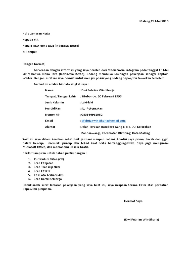 Contoh surat lamaran waiter waitress contoh surat untuk lamaran kerja cv surat pernyataan permohonan pengantar kerja umum keterangan. Miss hr department. Hal yang paling perlu diperhatikan adalah struktur penulisan surat dan kelengkapan isinya. Baik mereka yang baru lulus kuliah s1 atapun mereka yang lulus sma atau smk tidak hanya mereka yang fresh graduate yang membutuhkan surat lamaran kerja mereka yang ingin pindah kerja juga membutuhkan surat lamaran kerja untuk tempat pekerjaan. Hal ini adalah dampak dari meningkatnya persaingan di industri makanan yang bagi sebagian orang adalah sektor yang tepat untuk menghasilkan pundi pundi rupiah.