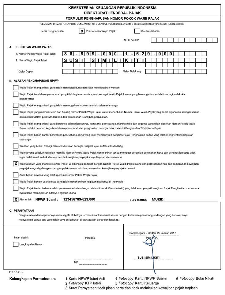 Nomor pokok wajib pajak npwp adalah nomor yang diberikan kepada wajib pajak sebagai sarana dalam administrasi perpajakan yang dipergunakan sebagai tanda pengenal diri atau identitas wajib pajak dalam melaksanakan hak dan memenuhi kewajiban perpajakannya. Persyaratan untuk memperoleh nomor pokok wajib pajak bagi badan dapat dibedakan menurut jenis badannya. Mengisi dan menandatangani formulir penghapusan nomor pokok wajib pajak. Berdasarkan pasal 1 angka 6 undang undang kup undang undang nomor 6 tahun 1983 yang terakhir diubah dengan undang undang nomor 28 tahun 2007 nomor pokok wajib pajak npwp adalah nomor yang diberikan kepada wajib pajak sebagai sarana dalam administrasi perpajakan yang dipergunakan sebagai tanda pengenal diri atau identitas wajib pajak dalam melaksanakan hak dan kewajiban perpajakannya. Sebaliknya definisi wajib pajak badan ialah badan yang mempunyai kewajiban perpajakan sebagai pembayar pajak pengambil atau pengutip pajak tergolong bentuk usaha permanen dan pemborong ataupun mekanik di bidang usaha hulu minyak dan gas bumi. Semoga apa yang telah admin sajikan bisa memberi gambaran kepada anda akan contoh surat tersebut dan semoga bisa bermanfaat untuk pembaca semua.