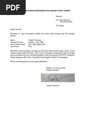 Itulah yang dapat kami bagikan terkait contoh surat keringanan pembayaran kartu kredit. By riwi1403 in types businesslaw surat permohonan pelunasan kta. Perpanjangan jangka waktu penyampaian spt tahunan tersebut. Apabila surat pernyataan ini telah ditandatangani mohon dapat dikirimkan kembali kepada kami dalam format pdf tidak melebihi 2 mb disertai dengan foto copy ktp dan foto copy kartu kredit mandiri melalui faksimili ke nomor 021 5267370 52997722 atau dapat mengirimkan dokumen yang telah di scan. Contoh surat permohonan keringanan pelunasan kartu kredit. Surat permohonan contoh surat permohonan pelunasan langkah 2 sms akan dikirim ke nomor ponsel yang telah anda registrasikan untuk penukaran poin.
