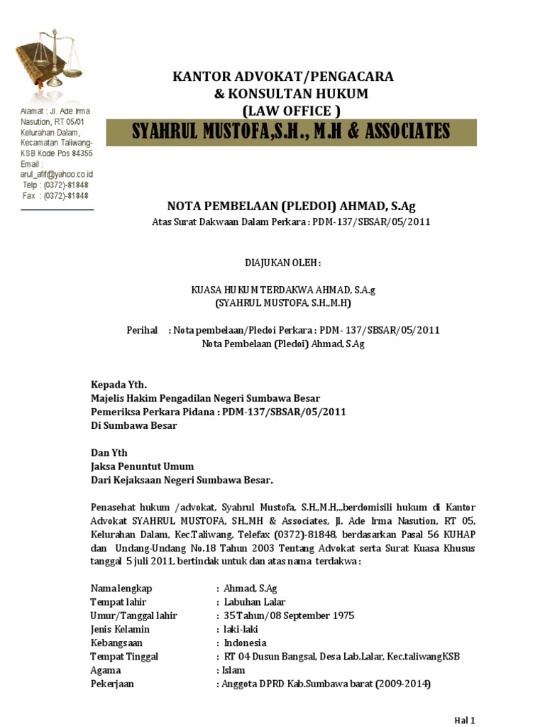 Kota agung 15. Kantor advokat rendi indrawan a butarbutar and friend jl. Contoh nota pembelaanpledoi juli 03 2012. Yang menguntungkan pihak terdakwa terdakwa membuat dan menyusun pembelaan terhadap diri terdakwa menyatakan banding terhadap putusan yang merugikan pihaknya membuat dan menyusun memorikontra memori banding tersebut menandatanganinya.