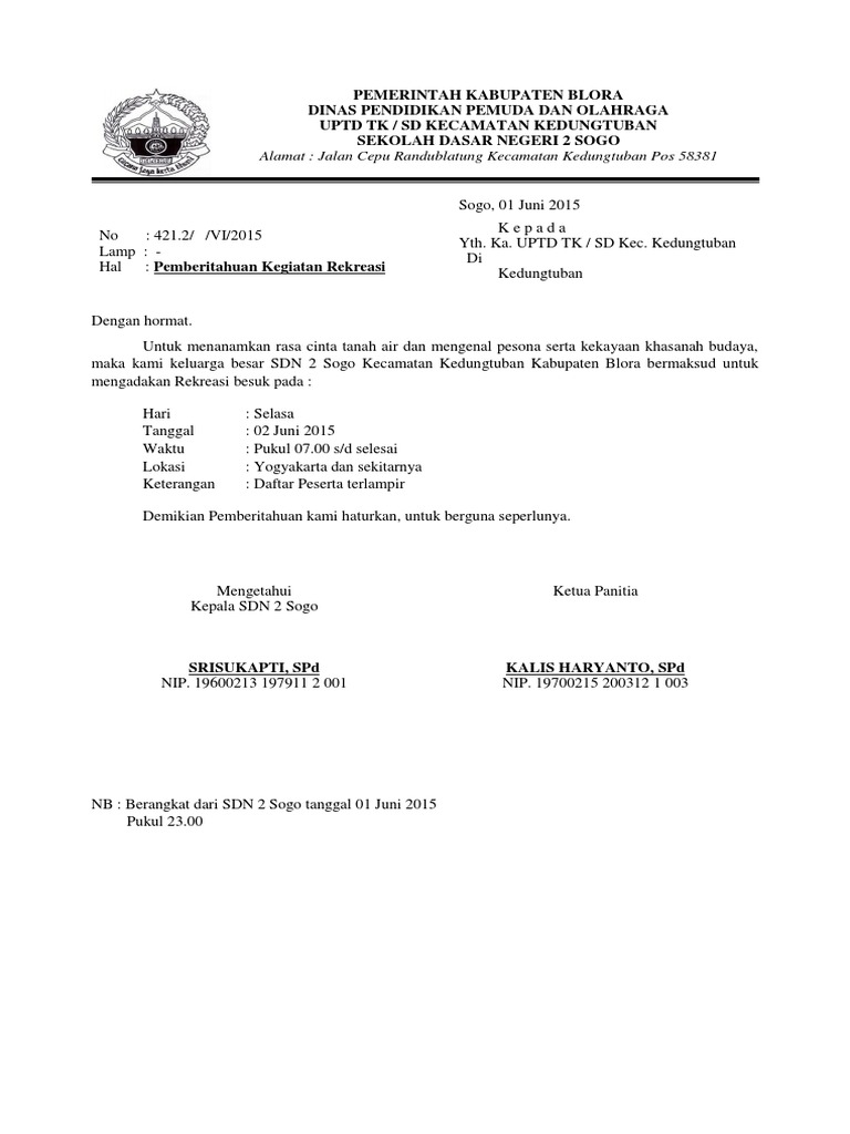 Contoh surat pemberitahuan kegiatan karya wisata. Contoh surat edaran pemberitahuan rekreasi sekolah tk ra. 15 contoh surat pemberitahuan kegiatan resmi yang baik seiring dengan kemajuan zaman dan perkembangan teknologi yang semakin canggih media komunikasi yang tersedia sekarang ini juga sudah semakin canggih. Surat berikut ini adalah contoh contoh surat pemberitahuan yang dapat di. Dalam kegiatan sekolah smasmkmasmpmts atau bahkan sd sering kali kita jumpai adanya sebuah study tour wisata atau bisa juga ziarah wali songo. Diantara banyak surat yang sering masuk maupun keluar adalah surat pemberitahuan. Berdasarkan kalender pendidikan tahun akademik 20122013 tentang program karyawisata karyawisata merupakan program yang harus diikuti oleh calon peserta ujian nasional yang akan datang yaitu siswa kelas vii dan viii guna mendapatkan data yang otentik tentang sejarah dan budaya setiap objek yang dikunjungi dan dituangkan dalam sebuah karya tulis yang harus disetorkan secara individu kepada.