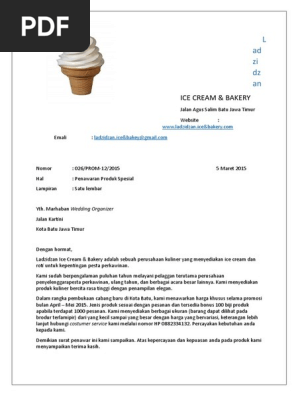 Contoh surat pemesanan ice cream dan bakery. Untuk melengkapi pesanannya kami juga telah melampirkan rincian daftar pesanan bersama surat pesanan ini. Untuk perhatiannya kami ucapkan banyak terima kasih. Anda sedang membuka postingan contoh surat penawaran ice cream yang berada pada kategori contoh surat dengan tag postingan berikut contoh balasan surat penawaran ice cream bakery contoh balasan surat penawaran ladzidzan ice cream bakery contoh balasan surat penawaran produk ice cream dan bakery contoh surat balasan penawaran ice cream dan bakery contoh surat. Dalam contoh surat penawaran ladzidzan ice cream bakery gawe cv telah memilihkan tema atau template yang terbaik untuk dijadikan inspirasi ide ataupun acuan dalam penulisan surat anda. Adapun produk kuliner yang kami perlukan adalah sebagai berikut terlampir. 026prom 122015 5 maret 2015 dengan ini kami memesan produk kuliner dari perusahaan ladzidzan ice cream bakery.