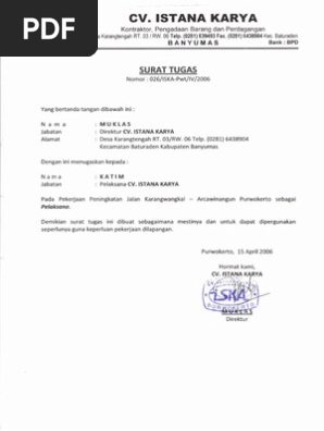 Surat tugas harus terkandung isi surat yang menerangkan bahwa adanya penugasan atas wewenang dari satu orang ke orang lain guna untuk mengerjakan suatu pekerjaan atau kepentingan yang dimandatkan berdasarkan isi surat tugas itu sendiri. Apa itu surat tugas. Ciri ciri surat tugas yang baik. Pada umumnya ciri ciri surat tugas memiliki beberapa hal yang harus diperhatikan meliputi. Jika ingin memberikan tugas kepada bawahan maka seorang atasan tentu akan menggunakan surat tugas atau surat penugasan. Dalam hal ini detail dari tugas yang harus dikerjakan dibuat dengan jelas pada isi surat.
