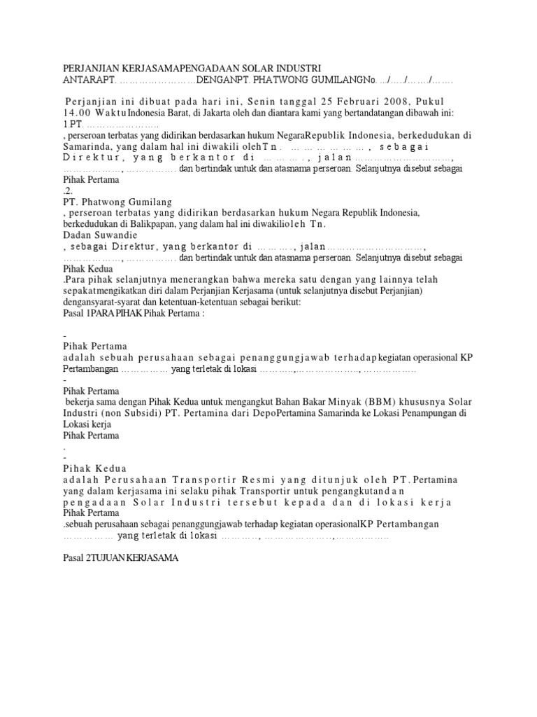 Biaya bahan bakar kendaraan dan oli mesin pemanfaatan kendaraan cocok kualifikasi teknisnya. Pihak kedua menjamin kelancaran pengiriman bahan bakar minyak solar industri dari pertamina sampai dilokasi tujuan dengan aman dan baik secara kuantitas dan kualitas serta tepat waktu standarisasi keamanan ditunjukkan dalam bentuk dokumen dan ikat segel pada tangki pengiriman yang dipasang dari depo pertamina dan buka segel di lokasi tujuan. Walaupun contoh surat perjanjian jual beli tanah ini nampak ringkas namun ia sangat penting dan berguna kepada anda sebagai pembeli atau penjual. Tetapi nilainya besar maka anda membutuhkan surat perjanjian jual beli. Contoh contoh dokumen hukum selasa 16 desember 2014. 4 contoh surat perjanjian paling banyak digunakan saat dua orang atau pihak melakukan sebuah perjanjian atau kesepakatan maka diperlukan bukti secara tertulis yaitu berupa surat perjanjian berisi data pihak yang bersangkutan waktu serta perihal yang disepakati.
