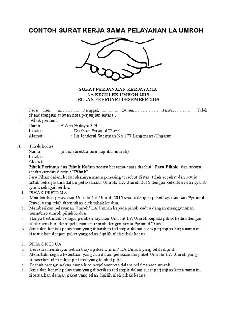 Facebook twitter newer post older post search here. Hanya bertindak sebagai pemberi layanan umroh la umroh kepada pihak kedua dengan tidak memiliki klaim pelaksanaan umroh dengan nama pyramid travel d. Bagi anda para pemilik jasa transportasi mungkin contoh surat ini bisa dijadikan refrensi atau pembanding untuk mengajukan atau mnawarkan jasa anda kepada sebuah perusahan lembaga atau organisasi. Contoh surat perjanjian kerjasama tour dan travel pada kesempatan kali ini kami akan memberikan beberapa contoh surat untuk perjanjuan kerjasama dalam bidang bisnis. Dalam contoh surat perjanjian kerjasama travel gawe cv telah memilihkan tema atau template yang terbaik untuk dijadikan inspirasi ide ataupun acuan dalam penulisan surat anda. Draft perjanjian kerjasama umrohdocx.
