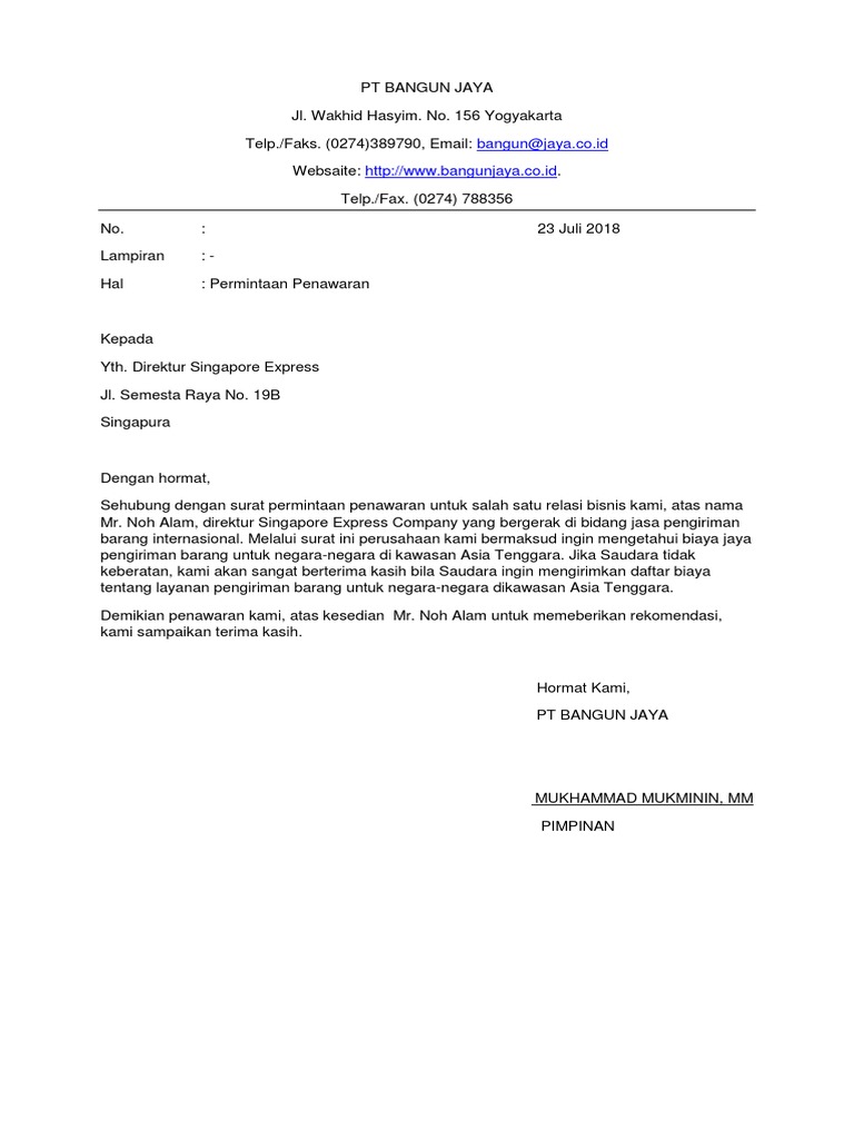 Jenis surat ini berisi tentang maksud dari perusahaan perdagangan agar bisa menjalin kerja sama dengan perusahaan yang lainnya. Adapun surat masih kerap digunakan sebagai alat komunikasi secara formal antar pihak yang berkepentingan selain itu dengan dibuatnya sebuah surat pastinya memiliki tujuan tertentu dan bisa dikatakan dengan. Dalam ilmu administrasi perkantoran memang ada beberapa jenis surat yang dipelajari berdasarkan bentuknya. Surat yang juga disebut sebagai surat bentuk lurus ini merupakan kombinasi dari bentuk surat full block style dan semi block style. 15 contoh surat permintaan penawaran barang dan jasa bagi sebuah perusahaan penggunaan surat sebagai media komunikasi merupakan hal yang wajib untuk dilakukan. Bentuk surat lurus atau surat bentuk block style ini mirip dengan bentuk surat lurus penuhhanya perbedaannya terletak pada penempatan penulsian tanggal surat salam penutup nama penanda tangan dan jabatan penanda tangan yang ditempatkan di bagian kanan surat.