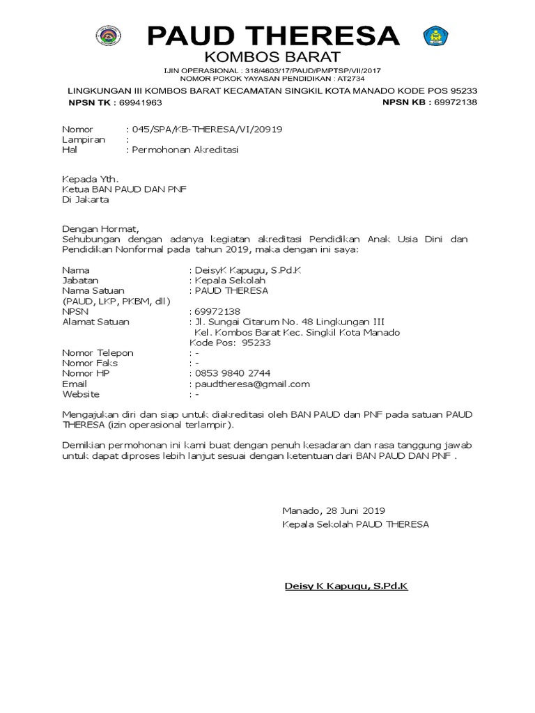 Download proposal permohonan akreditasi paud akreditasi tk kb. Contoh format surat permohonan akreditasi sekolah paudtk dikmas ban pnf.