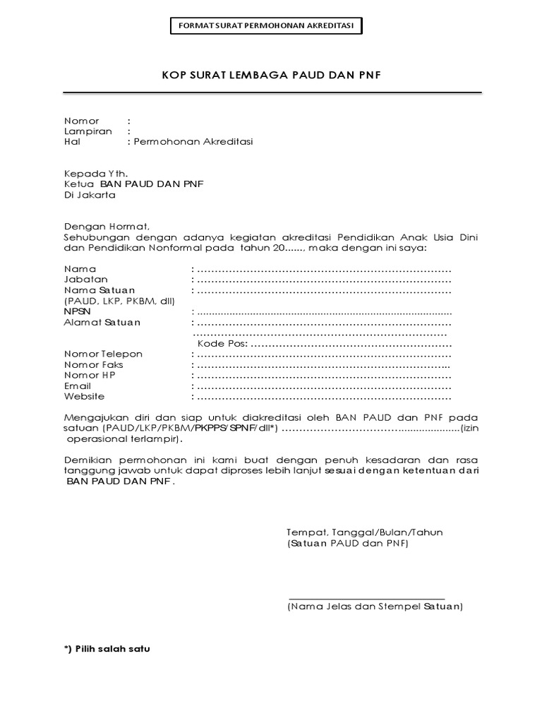 Persyaratan surat permohonan akreditasi paud. Ukuran kertas yang digunakan. Yang dapat di akses melalu laman banpaudpnfkemdikbudgoidsispena. Demi kelancaran dalam proses permohonan pengajuan akreditasi sekolah baik sekolah yang bernaung di diknas dan kemenag apa bila ingin mengikuti peserta akreditasi harus membuat suara permohonan dahulu. Contoh surat permohonan akreditasi paud download pedoman atau panduan penyusunan proposal permohonan akreditasi paud tk raba kb tpa sps dan contoh proposal akreditasi paud dalam format doc yang dapat di edit untuk keperluan akreditasi sekolah paud ayah bunda semua. Contoh fomat surat permohonan akreditasi paud dan pnf operator dapodik paud dikmas 949 pm.