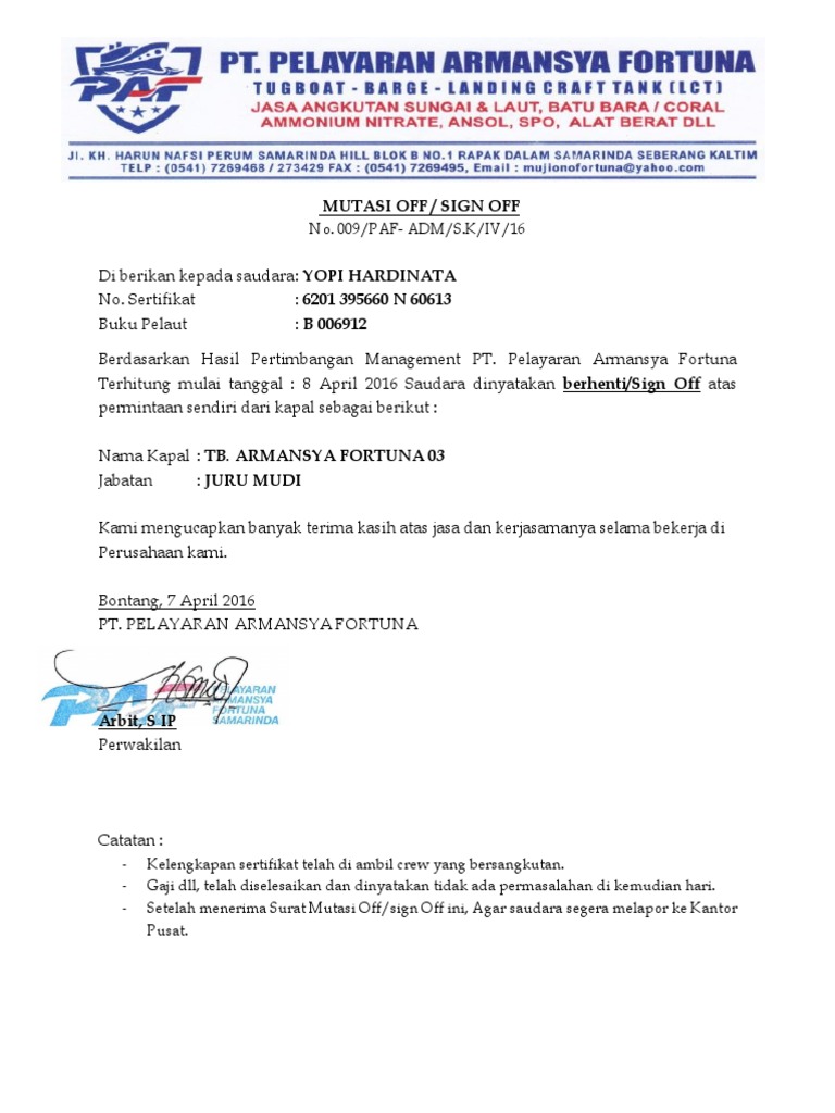 Contoh surat permohonan off dari kapal. Bagi awak kapal yang belum sempat melakukan sijil naikturun di syahbandar indonesia sign onsign off kbri kuala lumpur dan kjri di seluruh malaysia dapat memberikan layanan sijil ini kepada setiap awak kapal indonesiaadapun persyaratan untuk melakukan sign onsign off adalah. Artikel ini di update kembali buat sobat semu anya agar tampilan blog bisa cepat loading dan tidak menggangu sobat yang butuh contoh surat peng eluaran barang sebagian dari kepaeaan bea dan cuka indonesia contoh surat pengeluaran barang sebagian baik untuk. Gambar gambar sesuai dengan contoh surat permohonan off dari kapal. Contoh surat permohonan dan cara membuatnya hallo sahabat juragan sekalian sebelumnya admin ingin mengucapkan terimakasih karena telah mengungjungi laman situs pada artikel berikut ini. 1siapkan surat mutasi off dari kapal atau dari perusahaan yang asli dam fotocopy 1 lembar. Contoh surat permohonan dalam kehidupan sehari hari sering kali kita dihadapkan dengan suatu situasi yang tidak dapat dikerjakan dengan sendiri dan harus memerlukan bantuan pertolongan dari orang lainagar permohonan tersebut dikabulkan maka kita harus membuat sebuah surat permohonan yang ditujukan kepada pihak yang bersangkutan.