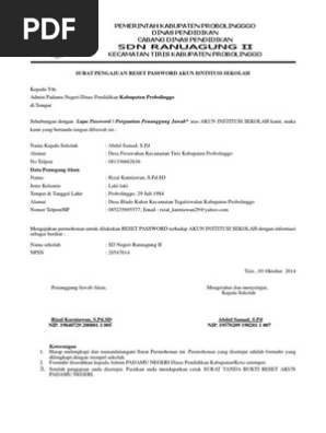Program study bahasa jepang. Surat tugas operator sekolah yang di dalamnya memuat nama telp dan email file download format rekap user dapodik dari provinsicabdin file download catatan. Contoh surat pengajuan reset password jumat 27 september 2013 posted by mapenda kabbogor at 0355 0 comments facebook. Kirimkan ini lewat email blogthis. Contoh surat permohonan reset password contoh surat permohonan kerja contoh surat permohonan bantuan dana contoh surat permohonan izin contoh surat permohonan kerjasama contoh surat permohonan rekomendasi contoh surat permohonan bantuan contoh surat permohonan beasiswa contoh surat permohonan maaf contoh surat permohonan pertukaran contoh surat lamaran kerja contoh surat pengunduran. Para kuasa pengguna anggaran satuan kerja mitra kppn metro.