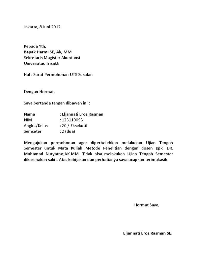 Contoh surat permohonan ujian susulan kuliah. Ketua stie sultan agung. Contoh surat permohonan ujian susulan selasa 14 mei 2013. Surat permohonan ujian susulan kepada. Contoh surat permohonan ujian susulan alasannya yaitu sakit opname di rumah sakit loading. Dengan hormat bersama surat ini saya n a m a.