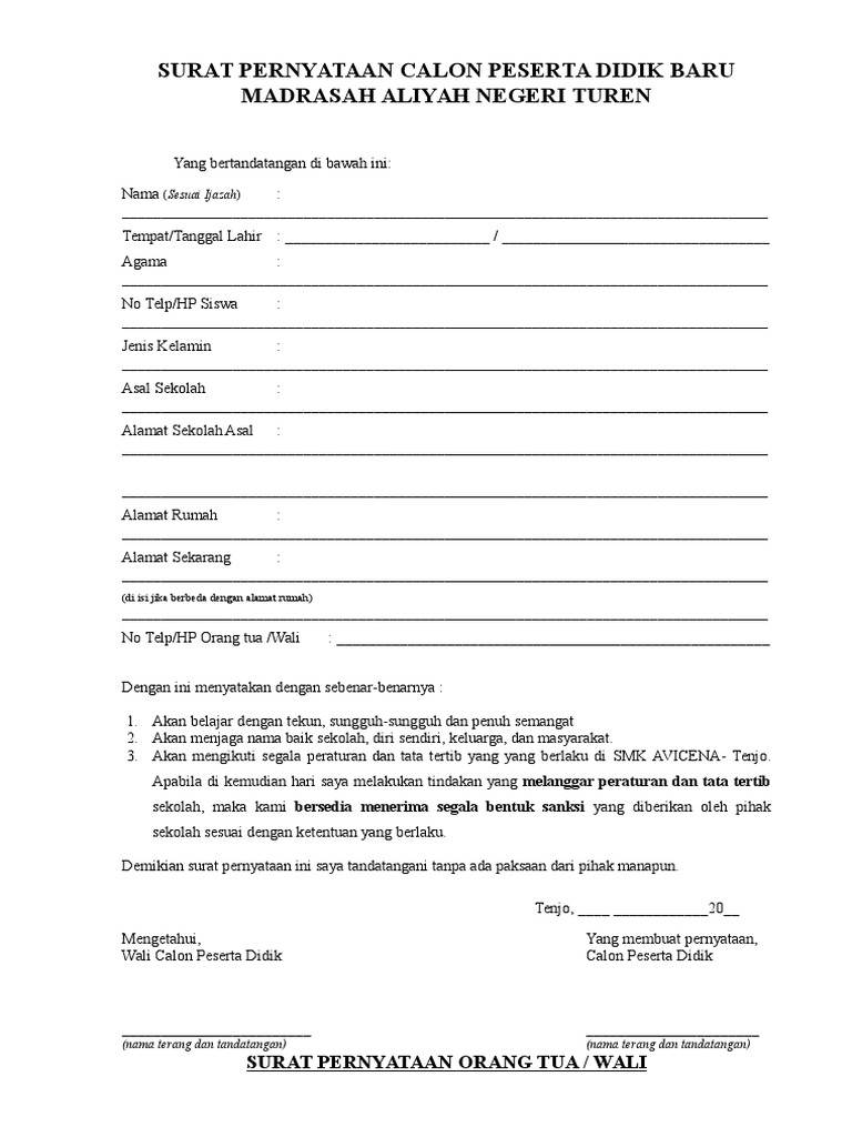 Contoh surat pernyataan orang tua siswa baru dan untuk kegiatan. Nah kali ini sobat pendidikan akan berbagi contoh tata tertib dan sanksi yang diberikan kepada siswa. Berbicara tentang sekolah setiap sekolah memiliki kebijakan dan aturan main tersendiri. Contoh surat pernyataan mengikuti tata tertib sekolah. Dan apabila dikemudian hari saya melanggaran peraturantata tertib madrasah. Untuk memberikan bimbingan dan pengawasan anak kami sebagaimana disebutkan diatas untuk patuh terhadap aturan dan tata tertib yang berlaku di sekolah sma negeri 66 kota surabaya.