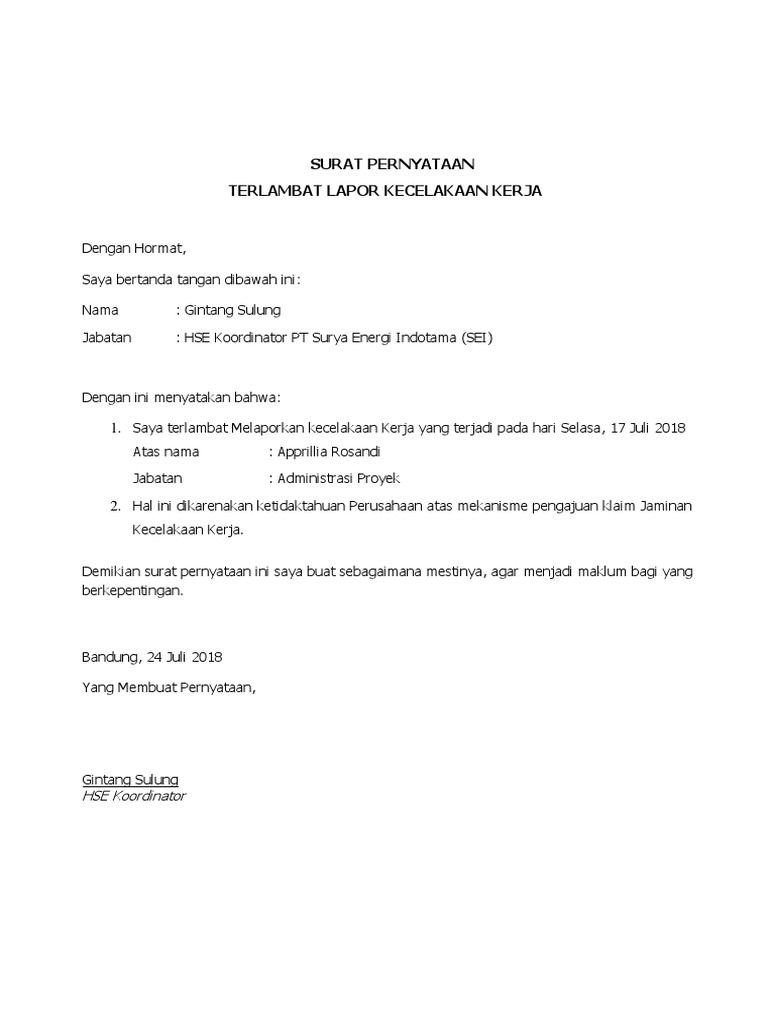 Surat pernyataan terlambat masuk kerja biasanya dibuat oleh karyawan yang terlambat masuk kerja di sebuah perusahaan yang berisi tentang pernyataan bahwa karyawan tersebut telah melanggar aturan yang ada di perusahaan. Contoh surat pernyataan maaf keterlambatan krs mahasiswa kuliah karena sakit opname berikut ini adalah sebuah contoh surat pernyataan maaf seorang orang tua wali dari mahasiswa yang terlambat mengisi krs karena sakit. Dengan hormat dengan ini diberitahukan bahwa saya yang namanya tersebut di. Sebagai seorang karyawan yang bekerja di sebuah perusahaan dan mendapatkan gaji maka tentu anda memiliki tanggung jawab terhadap perusahaan tersebut. Contoh surat pernyataan terlambat masuk kerja. Silahkan disimak contoh surat singkat ini sebagai bahan pertimbangan membuat surat maaf yang baik dan benar sesuai kaidah.