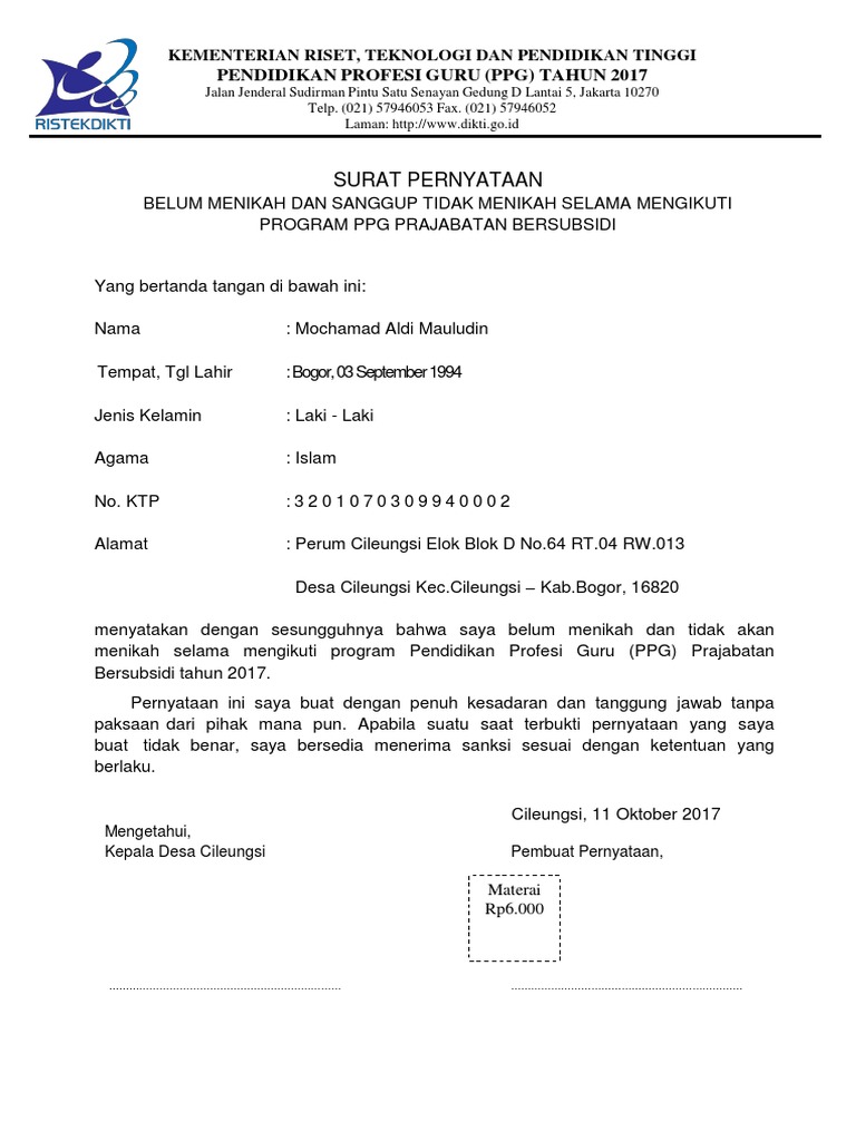 Contoh surat pernyataan tidak menikah. Namun untuk urusan komunikasi perusahaan maupun berbagai lembaga maupun instansi pemerintah penggunaan surat masih merupakan sesuatu hal yang wajib untuk dilakoni. Bukan hanya itu di luar negeri seperti di jepang dan korea juga mengharuskan pekerjanya masih lajang. Saya sanggup tidak menikah selama mengikuti pendidikan pada perguruan tinggi di lingkungan kementerian perhubungan. Karena sekarang ini banyak pekerjaan yang mempersyaratkan status pelamar yang masih lajang dan belum menikah. Terlebih jika penggunaan surat untuk komunikasi pribadi maka surat sudah sangat jarang kita temui. Demikian surat pernyataan ini saya buat dengan sesungguhnya dan untuk dipergunakan sebagaimana mestinya.