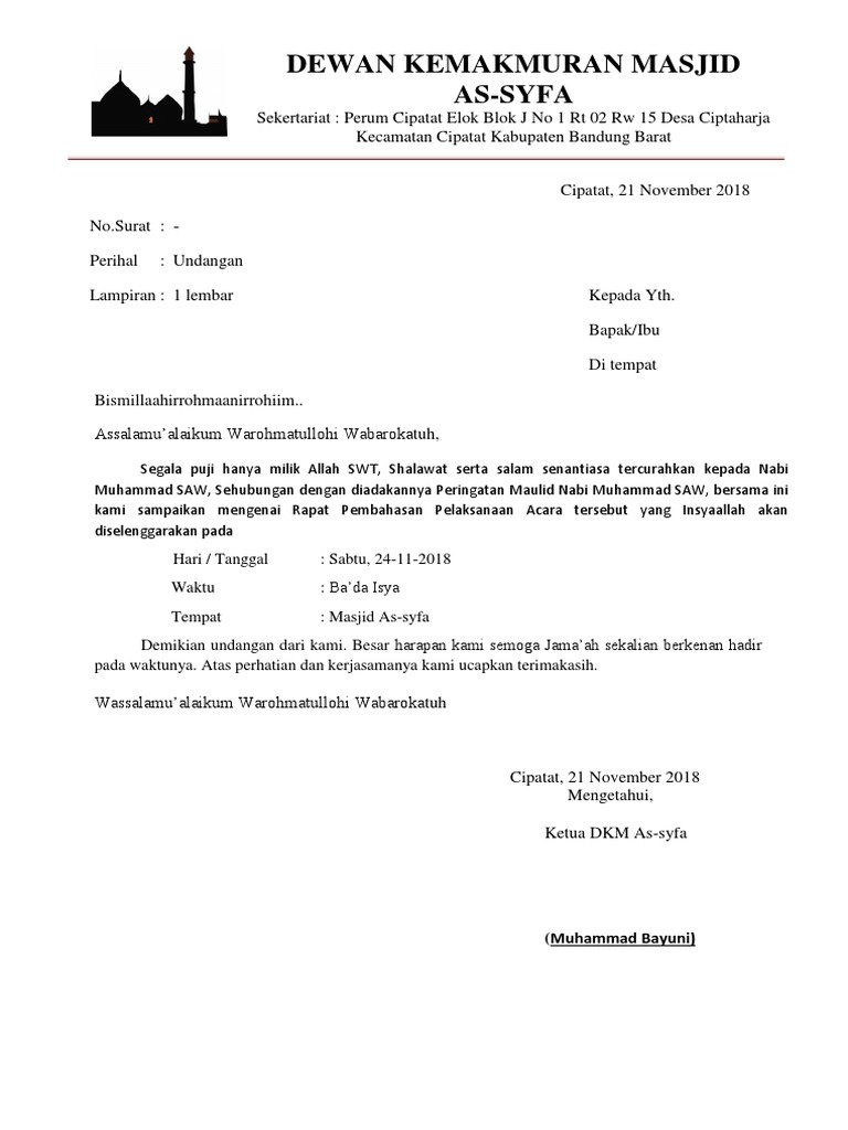 Contoh surat undangan masjid. Contoh surat undangan remas remaja masjid ini adalah format surat udangan untuk remaja masjid untuk bisa menghadiri forum atau silaturahmi remaja masjid di tempat anda sehingga bisa membahas tentang kemajuan untuk bisa menjadi remaja yang beragu didalam agam islam dan memberikan banyak sekali kemajuan di masjid anda untuk memberikan kegiatan untuk meramaikan masjid anda. Jika anda bekerja di bagian administrasi kegiatan surat menyurat adalah hal yang biasa dan membutuhkan sedikit pengalaman dan kemampuan dalam menulis surat. Disini akan saya share contoh undangan pengajian peresmian masjid selesainya pembangunan masjid. Daftar harga kubah masjid enamel. Surat undangan yang resmi merupakan sebuah surat yang dikeluarkan oleh lembaga perusahaan atau instansi tertentu untuk ditujukan kepada pihak pihak yang bersangkutan dengan tujuan untuk dapat menghadiri acara yang diselenggarakan. Contoh surat undangan acara peringatan maulud nabi surat undangan acara peringatan maulid nabi merupakan surat yang dibuat untuk mengundang dalam acara peringatan nabi muhammad seperti yang kita ketahui bersama maulid nabi merupakan peringatan lahirnya nabi muhammad sawyang biasa diperingati setiap tanggal 12 rabiul awal.